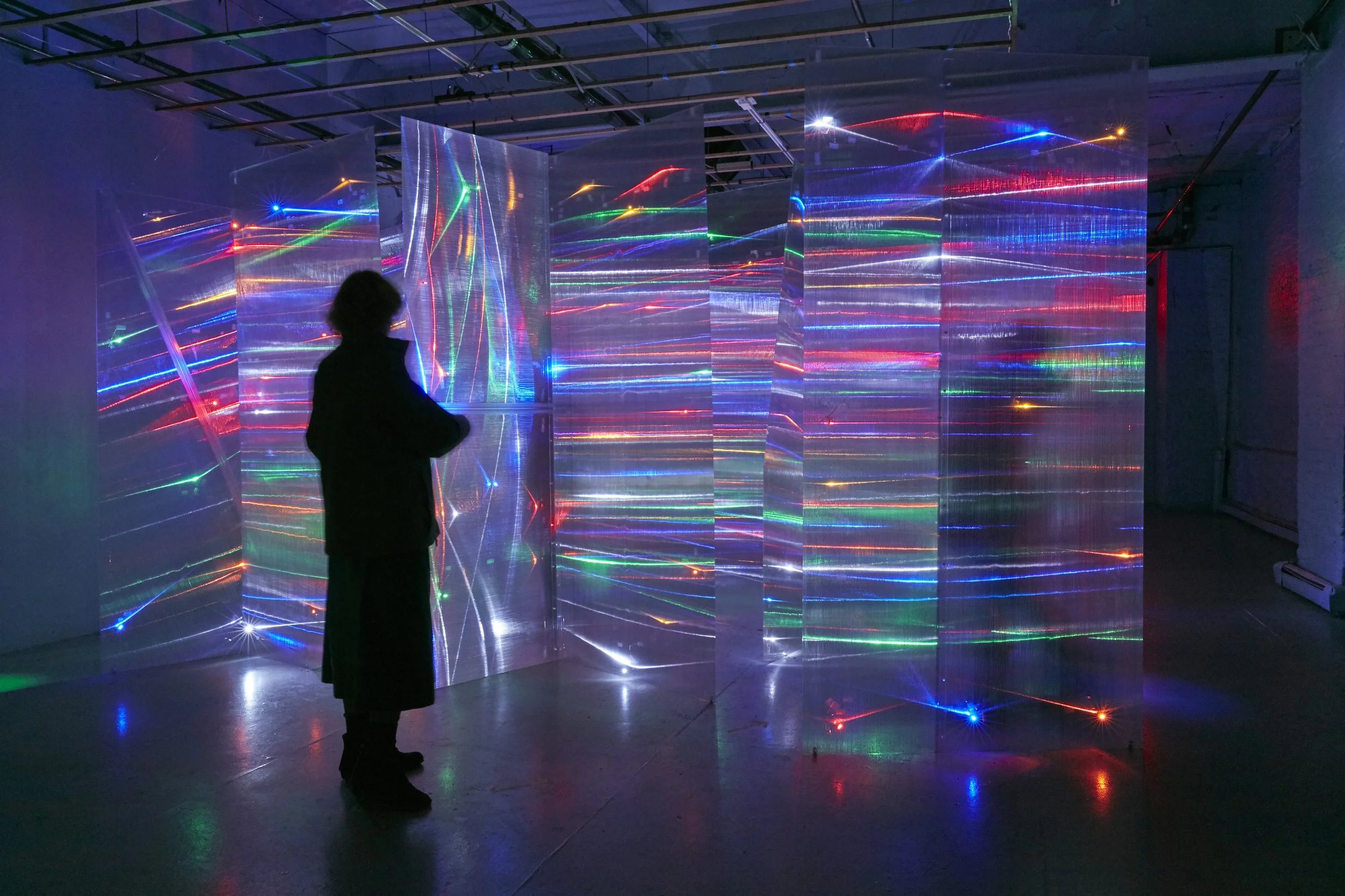 In this all-encompassing maze-like installation, LEDs form colored lines of light when reflected off translucent ‘walls’, confounding any sense of orientation. The viewers, as they walk inside the piece, complete it through their process of discovery. During performances, dancers wearing lights move through and activate the light-based artwork, creating moving lines of light. “A Sound Of Light, appearing around the bend” is in many ways inspired by a previous piece, entitled “The Cave”.